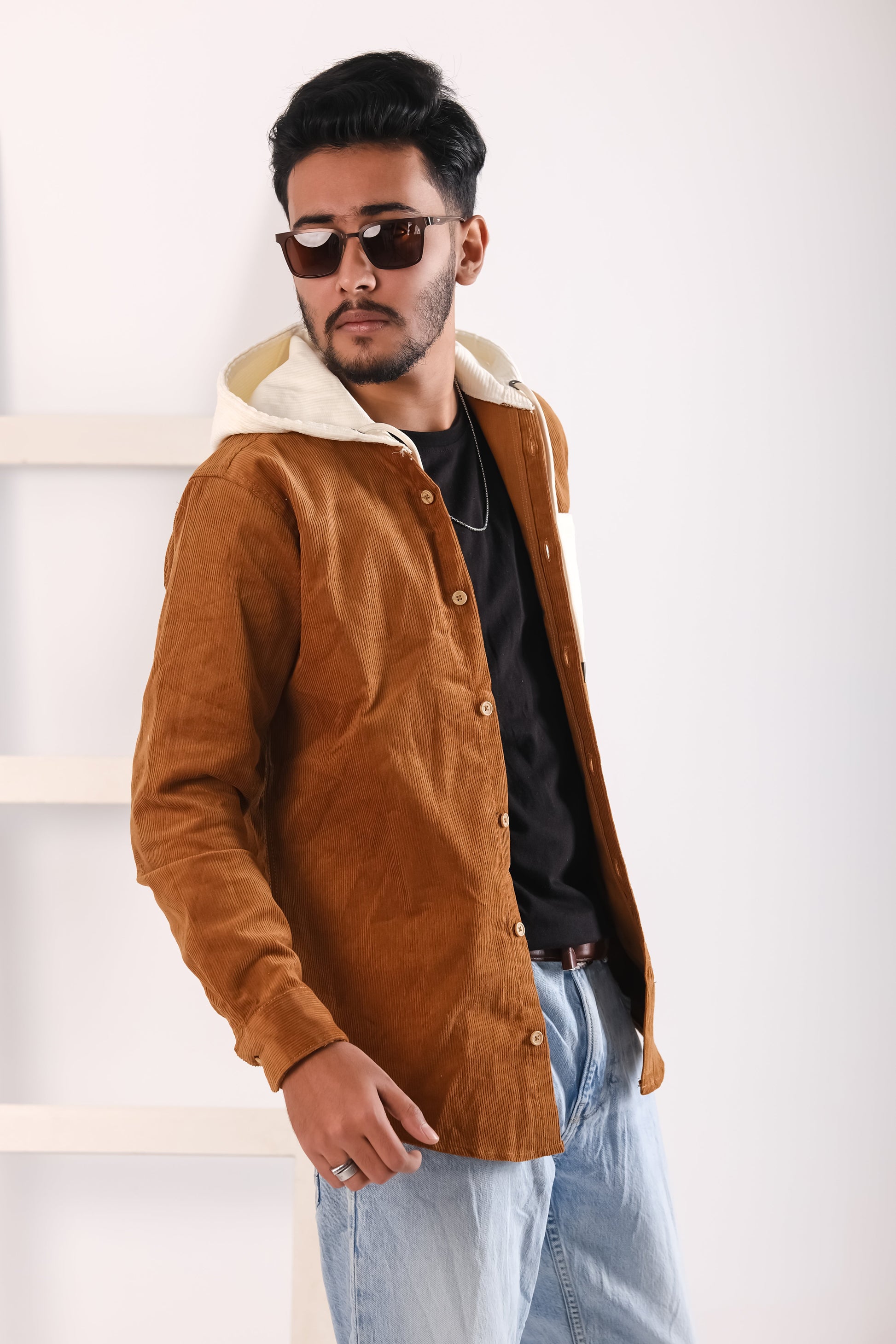 Men's Jackets Corduroy Hooded Shirt - Dark Brown