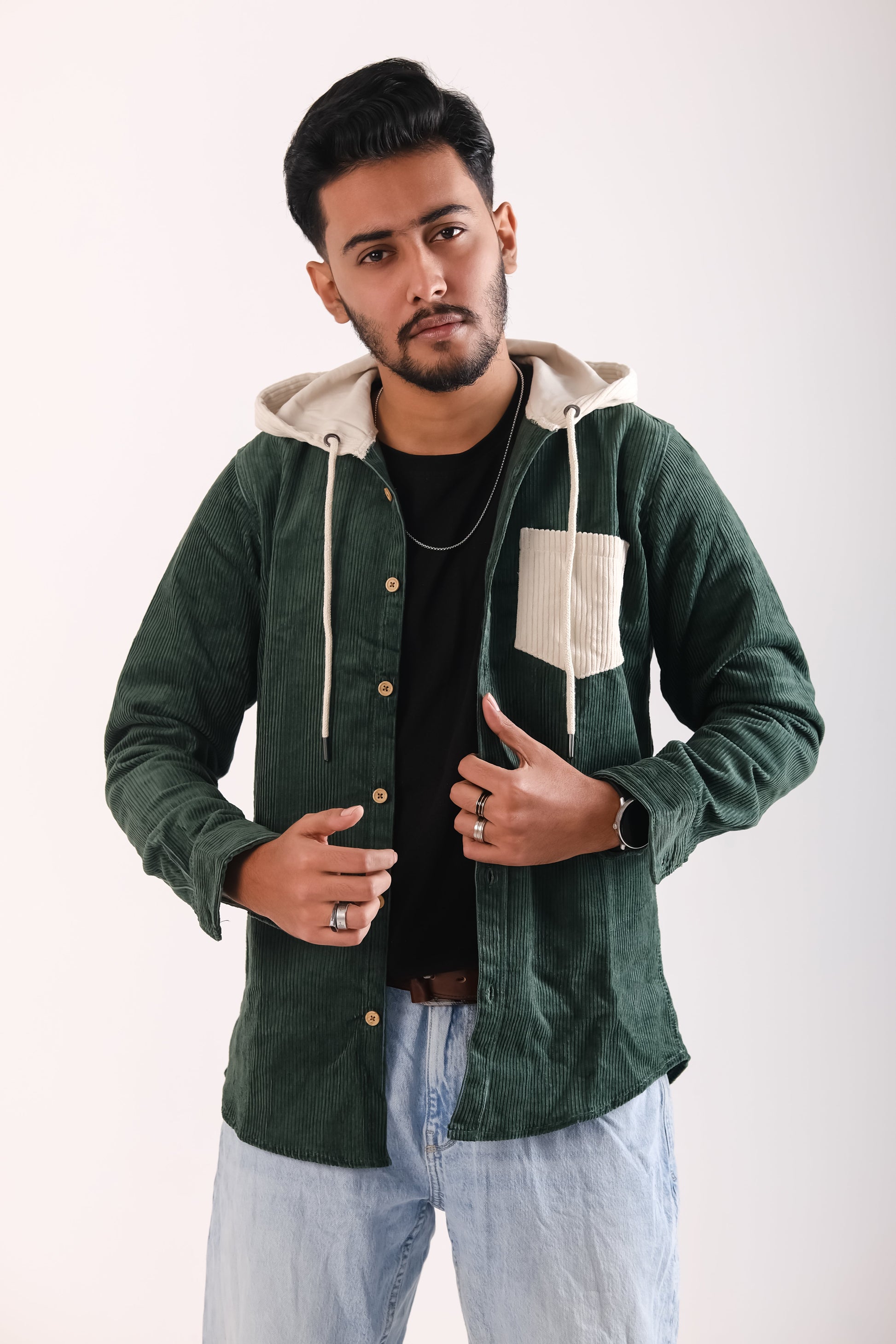 Men's Jackets Corduroy Hooded Shirt - Bottle Green